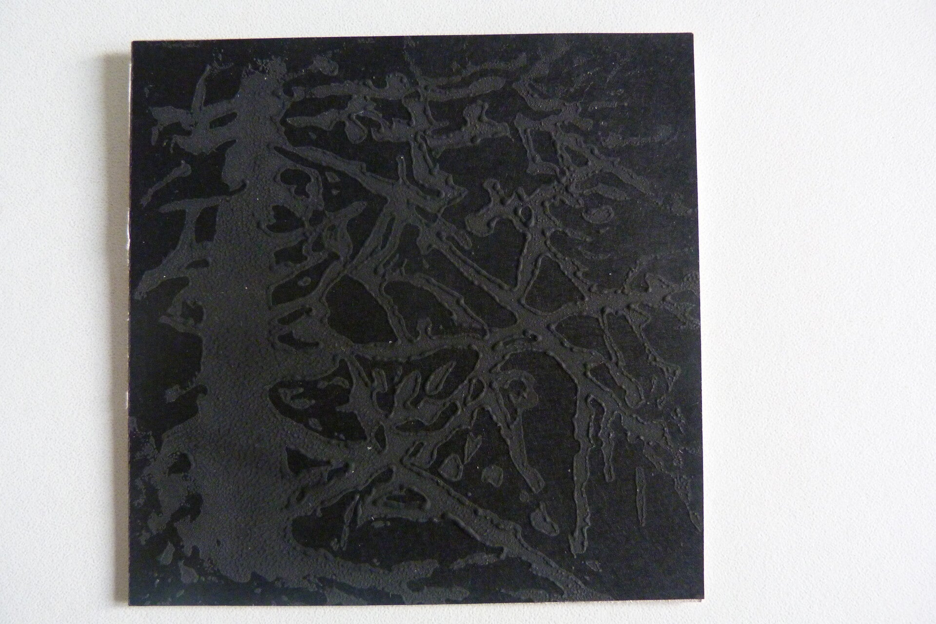 Encre linogravure noire sur feuille noire. Sur support rigide.